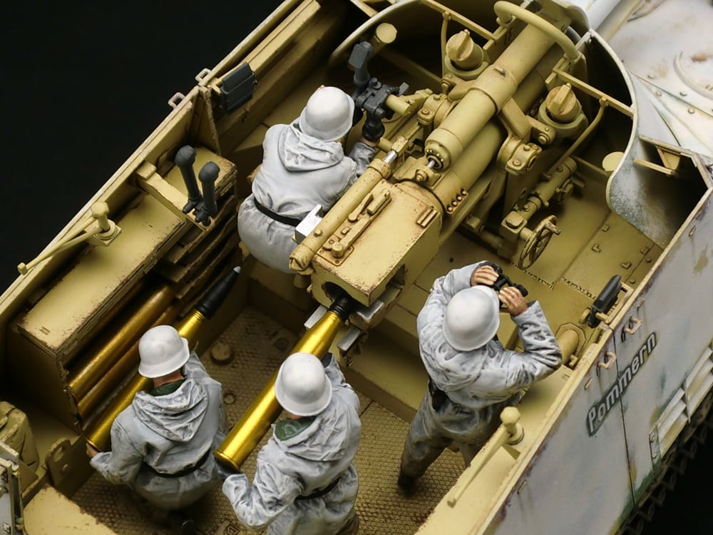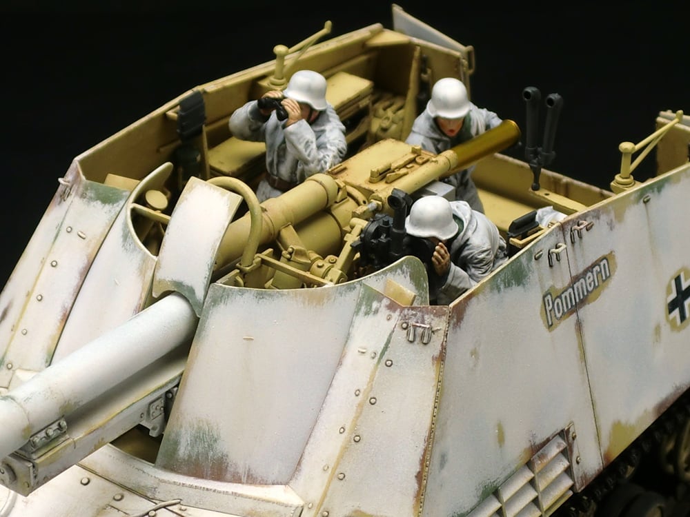 車両は3色迷彩の上に冬季迷彩を施し、塗装をはがして使用感を出しています。